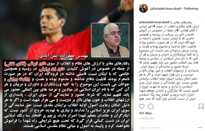 به گزارش باشگاه خبرنگاران، غلامعلی جعفرزاده ایمن نماینده مردم رشت در مجلس شورای اسلامی با انتشار پستی در صفحه اینستاگرام خود از برخی رفتارهای هنجارشکنانه علیرضا فغانی در حاشیه‌ مسابقات جام جهانی ۲۰۱۸ در کشور روسیه انتقاد کرد.این نماینده مجلیس در اینستاگرام خود نوشت:«رفتارهای مغاير با ارزش های نظام و انقلاب از سوی داور ايرانی (آقای فغانی) از جمله در خصوص در آغوش كشيدن داور زن برزيلی در روسيه و همچنين خانمی كه با ايشان نسبت فاميلی داشته در فرودگاه ايران كه درهر صورت نامحرم بودند قابليت دفاع نداشته و مذموم بوده و هست و وزارت ورزش و جوانان می بايست اين موضوع را به كليه ورزشكاران و داوران و مربيان و هر آن كس كه با نام ايران اسلامی در ميادين و عرصه های بين المللی حضور می يابد تفهيم نمايد كه شرط حضورو نمايندگی از سوی ايران ، پاسداری از ارزشهای انقلاب و خون بهای بالغ بر دويست و سی هزار شهيد است و اگر به هر دليل امكان رعايت اصول اوليه انقلاب برايشان مقدور نيست حق نمايندگی از سوي ايران عزيز اسلامی را ندارند و نيازی به تهديد خروج از كشور نيست كه ايثارگران و خاندان معظم شهدا اصرار دارند پرچم پر افتخار سه رنگ اسلامی ايران در دست كسانی قرار گيرد كه تحت هيج شرايطی راه شهدا را فراموش نخواهند كرد و پايبند به اصول و مبانی نظام مقدس اسلامی هستند.»