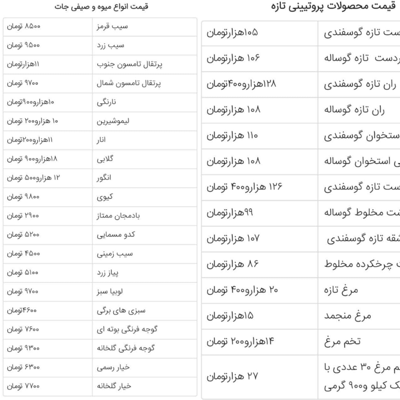 جدیدترین قیمت گوشت، مرغ، میوه و صیفی جات