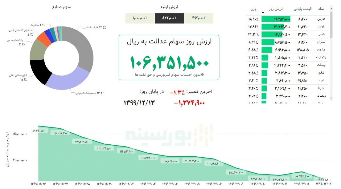 در پایان معاملات امروز بازار سهام، ارزش سهام عدالت درمقایسه با روز گذشته، ۱.۳درصد (۱۳۷هزار تومان) کاهش یافت و ارزش سبد ۵۳۲هزار تومانی و یک میلیون تومانی سهام عدالت به ترتیب به ۱۰ میلیون و ۶۳۵هزار تومان و ۲۰ میلیون و ۳۲هزار تومان رسید.