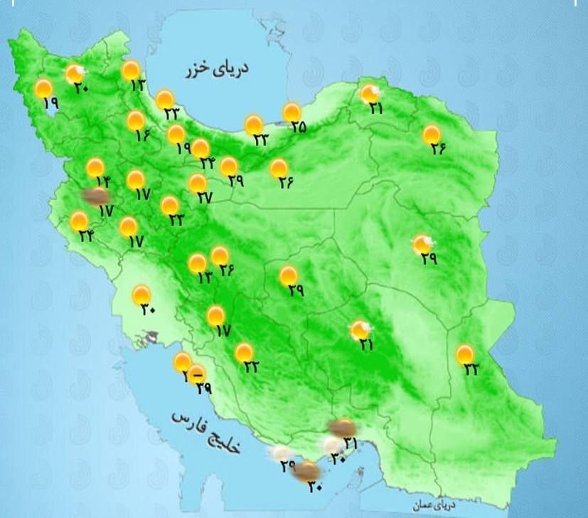 بیشینه دمای امروز تهران به ۳۷درجه و فردا به ۳۸ درجه می‌رسد، کمینه دما هم امروز به ۲۴ درجه خواهد رسید و برای مناطق جنوبی احتمال گرد و خاک هم وجود خواهد داشت.