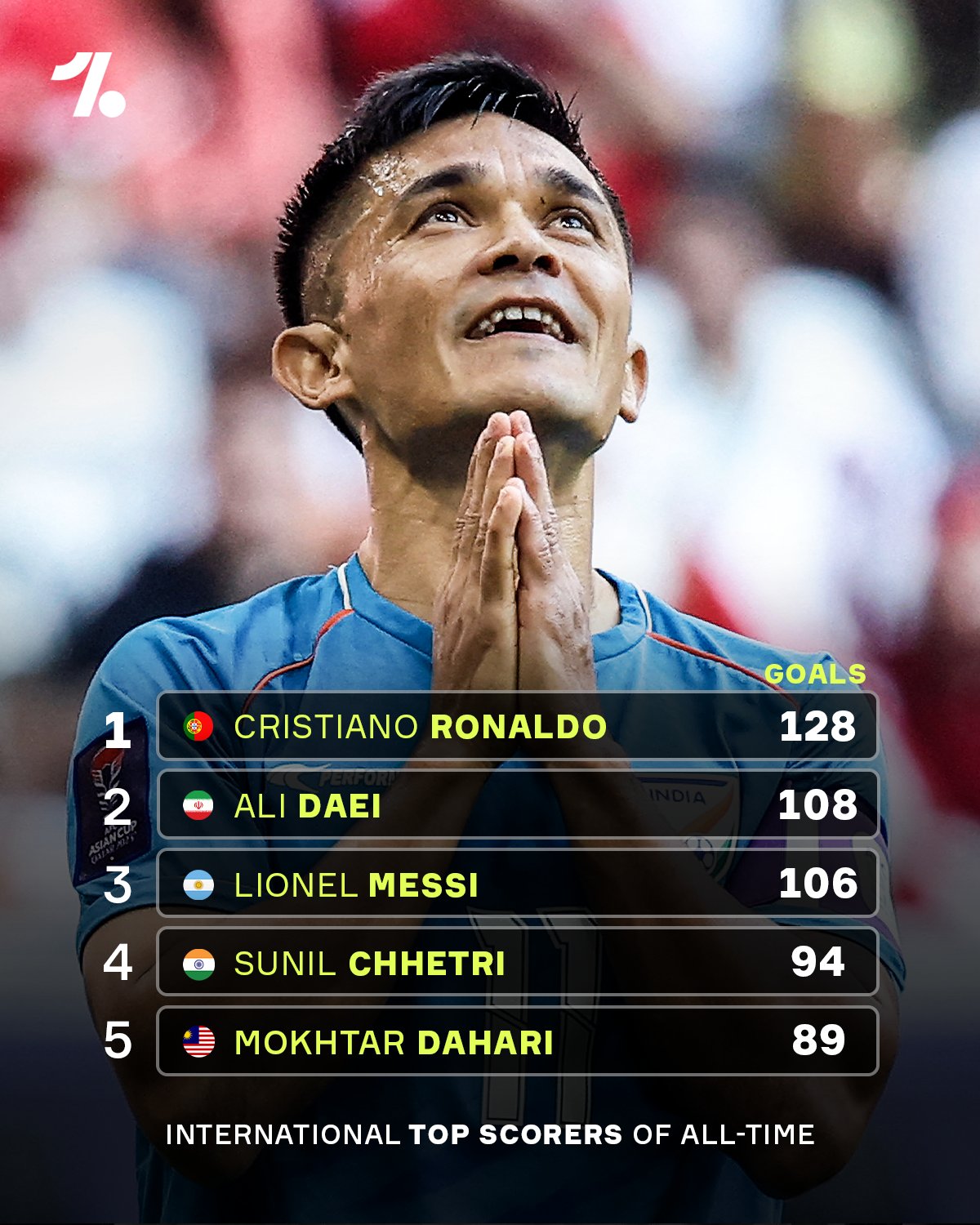 سونیل چتری 39 ساله پس از کریستیانو رونالدو از پرتغال با 128، علی دایی از ایران با 108 و لیونل مسی با 106 گل با 94 گل در رده چهارم برترین گلزنان تاریخ بازی‌های ملی قرار داشت و حالا او پس از 20 سال بازی برای هندوستان، به طور رسمی از مستطیل سبز خداحافظی کرد.