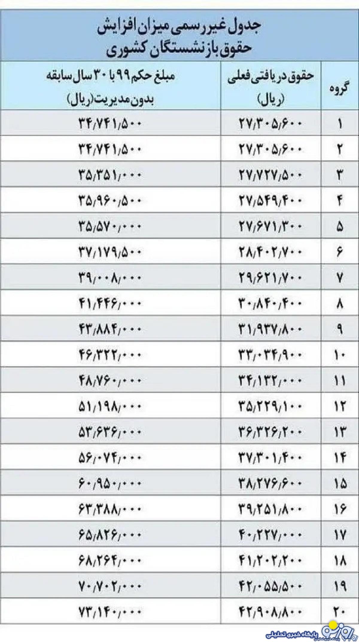 جدول محاسبه افزایش حقوق بازنشستگان با علی الحساب همسان سازی