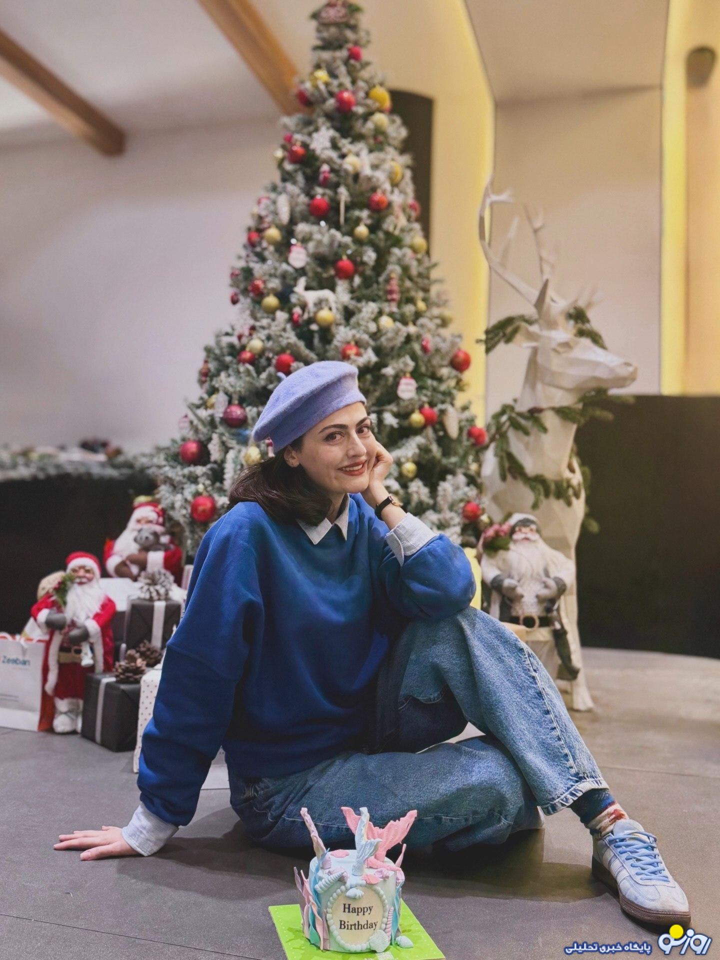 روزنو :خانم بازیگر در این عکس با استایلی کژوال به رنگ آبی شامل سویشرت، شلوار جین و کلاه برت بنفش، کنار درخت کریسمس و کیک تولد ژست گرفته.